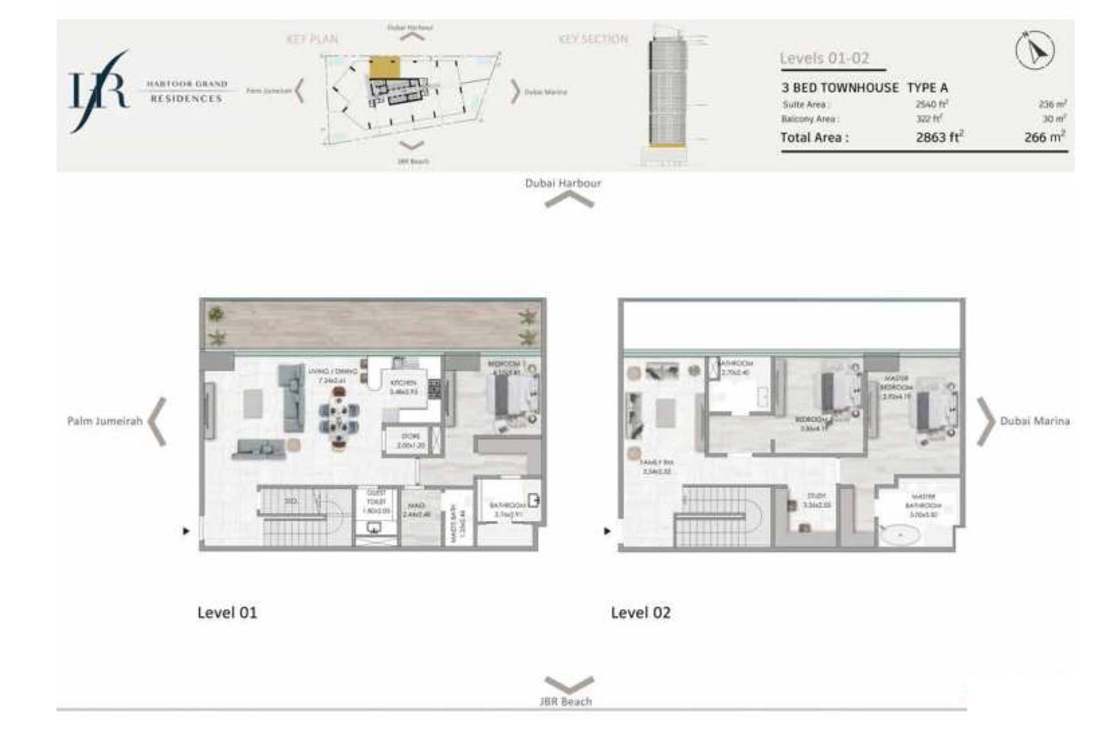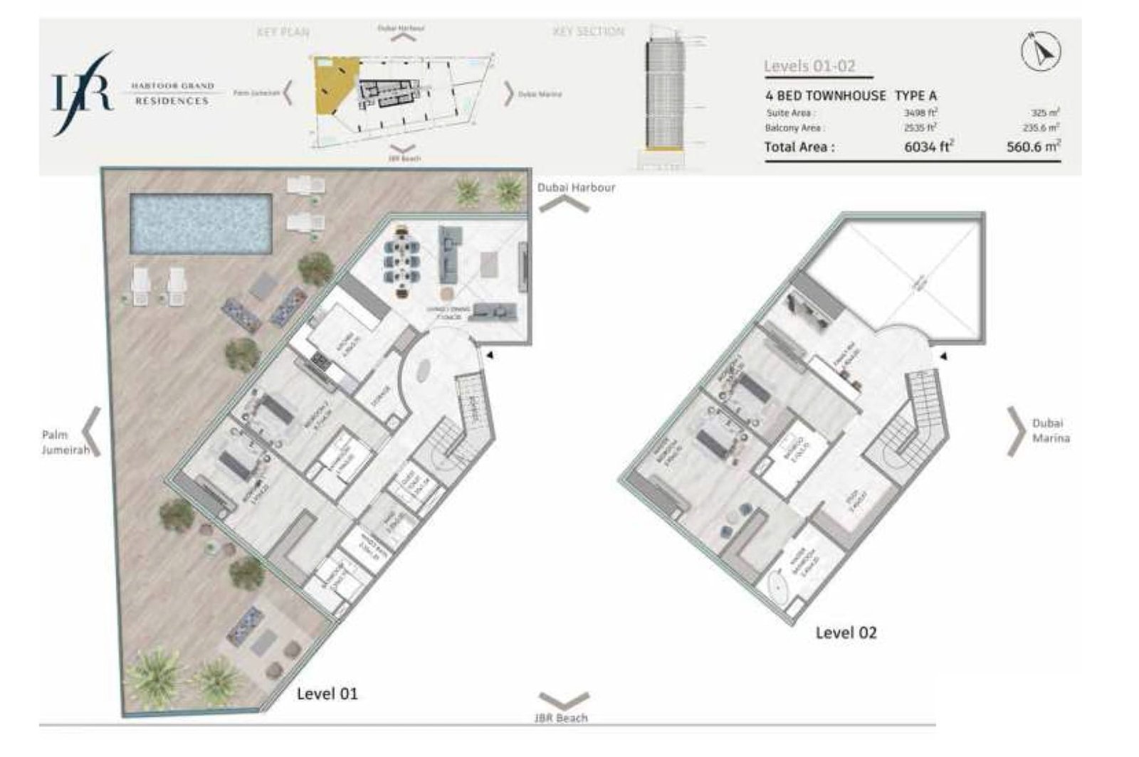 Habtoor Grand Residences is a 49-storey luxury tower in Jumeirah Beach, Dubai Marina, offering 2 to 4-bedroom apartments, townhouses, and penthouses with stunning views of the marina and the Gulf.