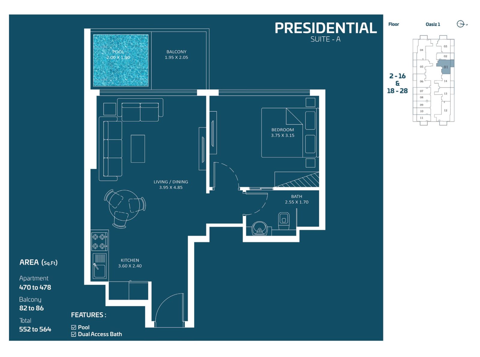 The amenities include a pool, gym, landscaped gardens, a children’s play area, social spaces, 24-hour security, parking, and concierge services, all designed to enhance convenience and comfort for residents.